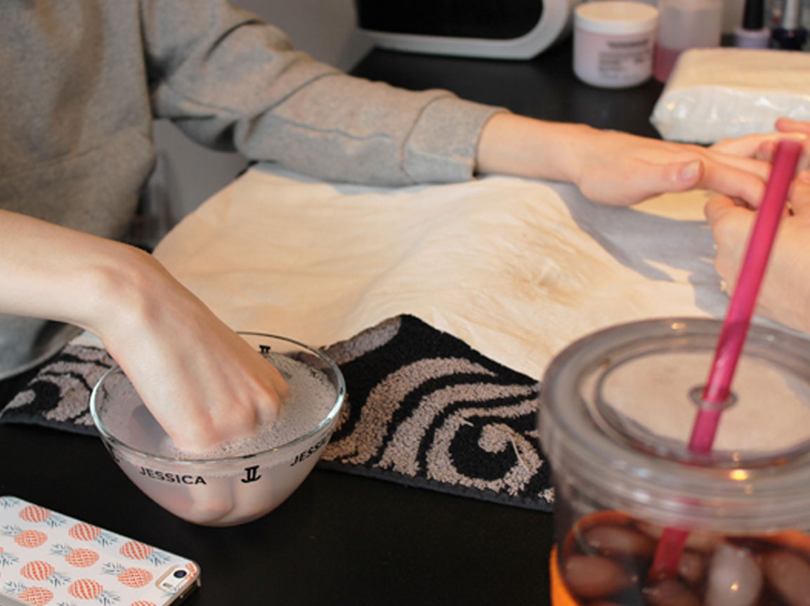After a quick soak in a little luke-warm water, she uses a spatula to apply Jessica’s Nourish Cuticle Formula to the base of each nail, and sets about gently pushing back the cuticles using a nail pusher and then taking away any excess with the cuticle nippers.